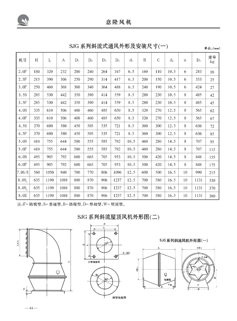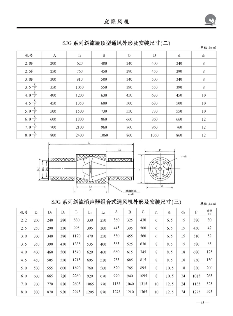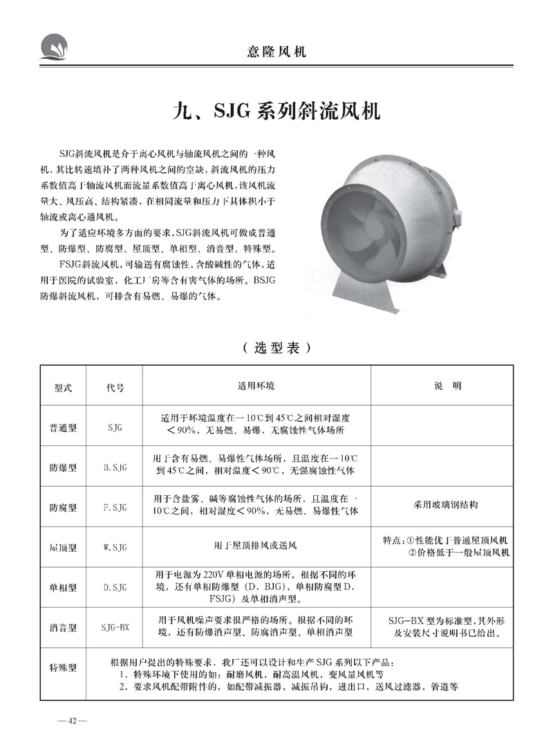 SJG斜流风机是介于离心风机与轴流风机之间的利风机,其比转速填补了两种风机之间的空缺,斜流风机的压力系数值高F轴流风机而流量系数值高小离心风机,该风机流最大、风压高。结构紧凑,在相同流量和压力下其体积小于